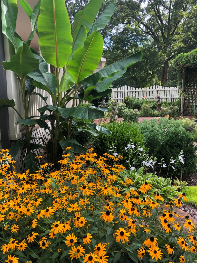 Red banana trees have flourished for years in our gardens. By the end of the growing season they are ten feet tall. Frost burns the leaves and the trees are cut down and composted. The trees return faithfully jn late spring and are a welcome food source for bees, butterflies and hummingbirds.