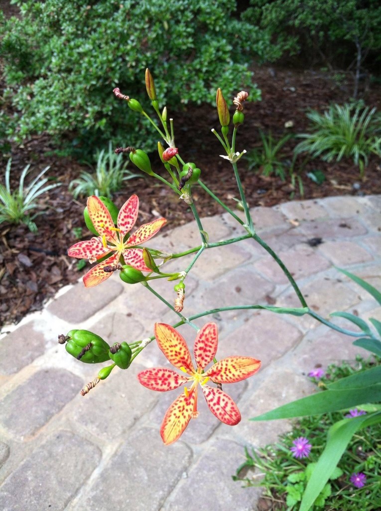 When I was an assistant principal at Parkview High School in Gwinnett County, a secretary named Jeanne Knox shared an interesting plant with me. I took the plant home to Lawrenceville, Georgia and transplanted it in our garden. That was thirty years ago. It made the move with us to Milton in 1992. The perennial has popped up just about everywhere in our gardens since then. I have never seen it in a plant nursery nor in any other gardens. It is the Blackberry Lily. Some of my readers may be familiar with it. Below are some images and further information.