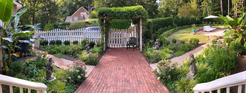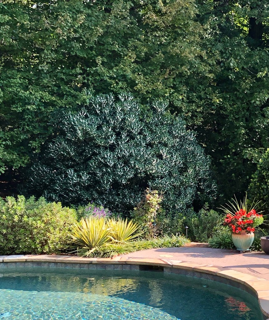 When our electrician Jay Norton installed landscape lighting, he christened the area the Serenity Garden. Plantings over the years have included perennials, podocarpus, osmanthus, aucuba , hydrangea, azaleas, and hostas.