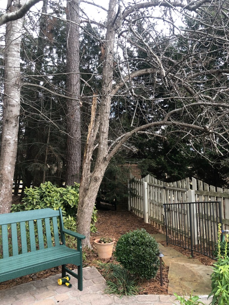 This year the pear tree was in decline and the trunk had split; our tree surgeon removed it. Mary and I discussed some planning of the new garden and our son Will donated spare time to remove old bedding perennials, dead shrubs, plant new shrubs and prepare the new planting bed. He planted new shrubs: podocarpus, aucuba, camellias and osmanthus. Mary and I have removed some scraggly liriope. We are planting mondo grass to reduce the brown color that dominates from the use of pine mulch groundcover. Along the way Will moved a large azalea and relocated landscape lighting wiring that interfered with new shrub planting. Mary has ordered replacement landscape lighting as needed, and Evan and Will have installed them.