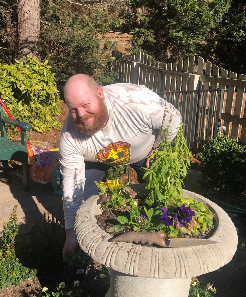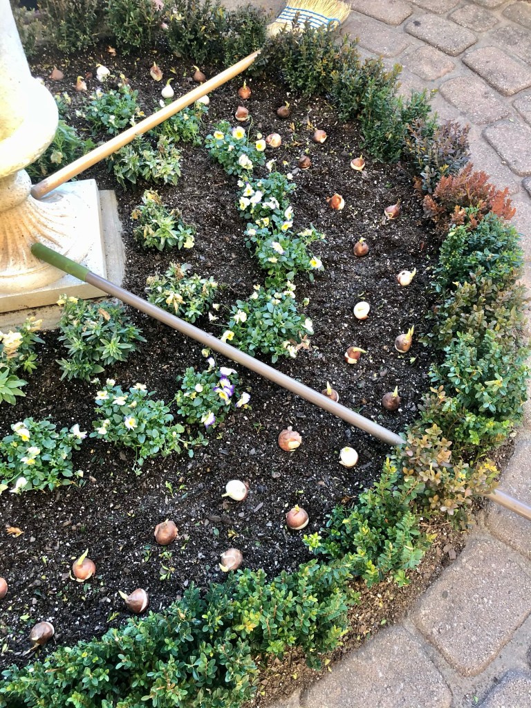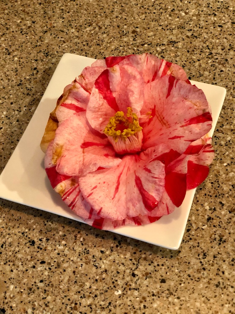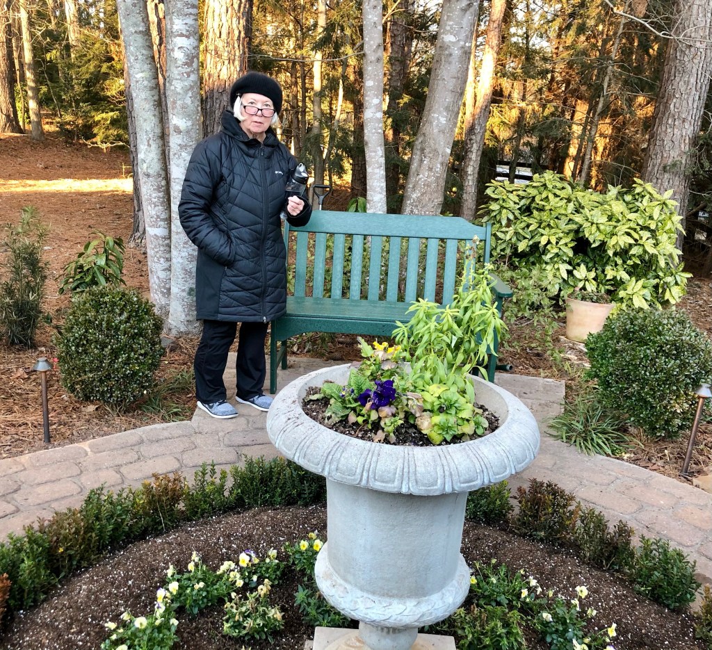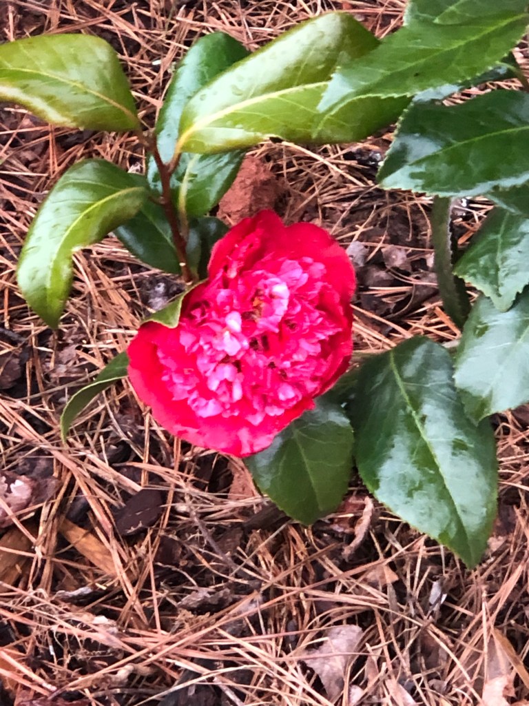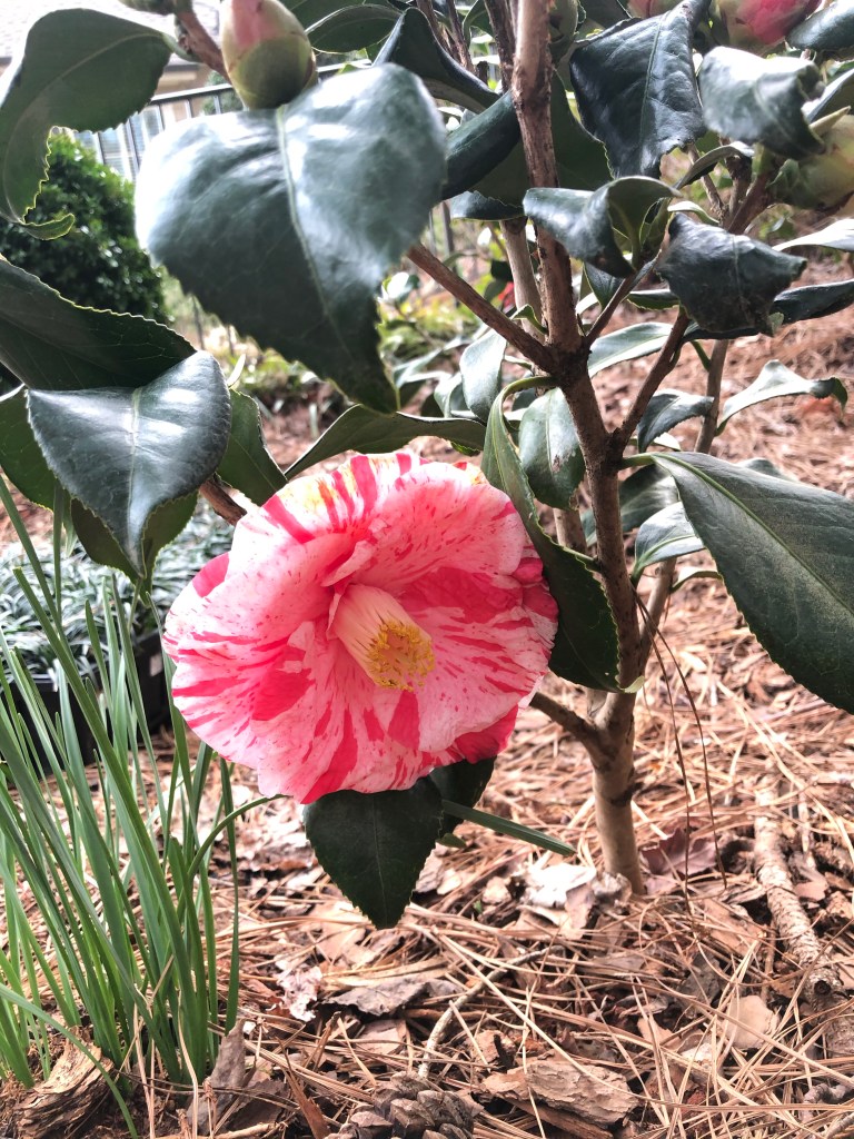 BeforeWill Green plants violas.Will planted violas, thirty ‘Baby Jade’ dwarf boxwoods and three dozen pre-chilled red tulip bulbs.Planting finished and boxwoods trimmed.Mary admires the garden redo.Camellia CamelliaFallen bloom was too pretty still to toss into compost pile.