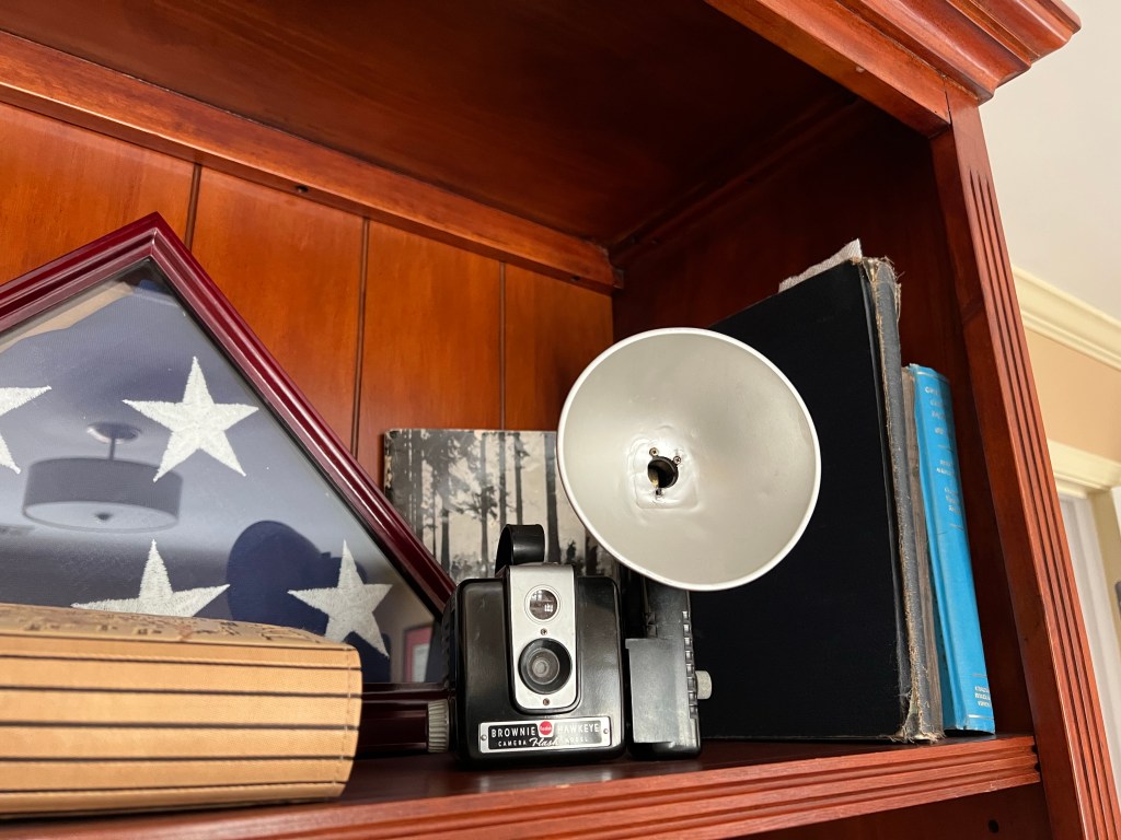 Biltmore House figurine c. 1980’sBill Cecil, Jr. and Michael Green met at Lenoir-Rhyne College at a talk in 2007. He is the CEO of the Biltmore Company. The company owns and operates Biltmore Estate. Bill is the great grandson of George W. Vanderbilt, the builder of Biltmore House. Kodak Brownie Hawkeye flash model camera circa 1957. The camera belonged to Charlotte Liddell Green.Flag used in funeral of Moses Frank Liddell, a veteran of WWII