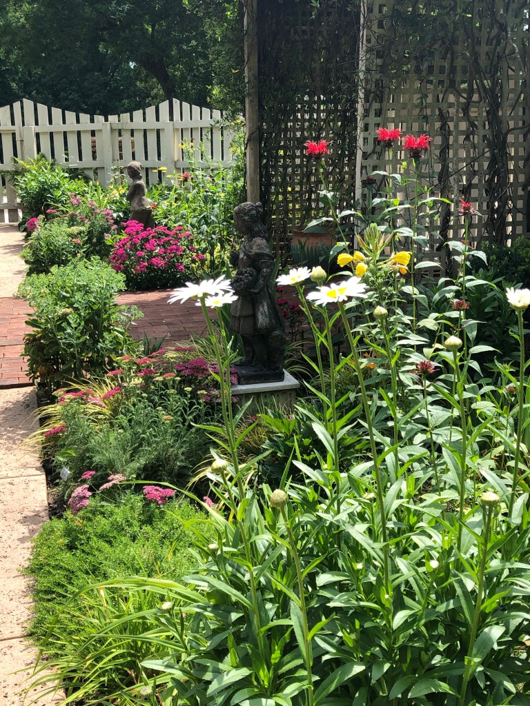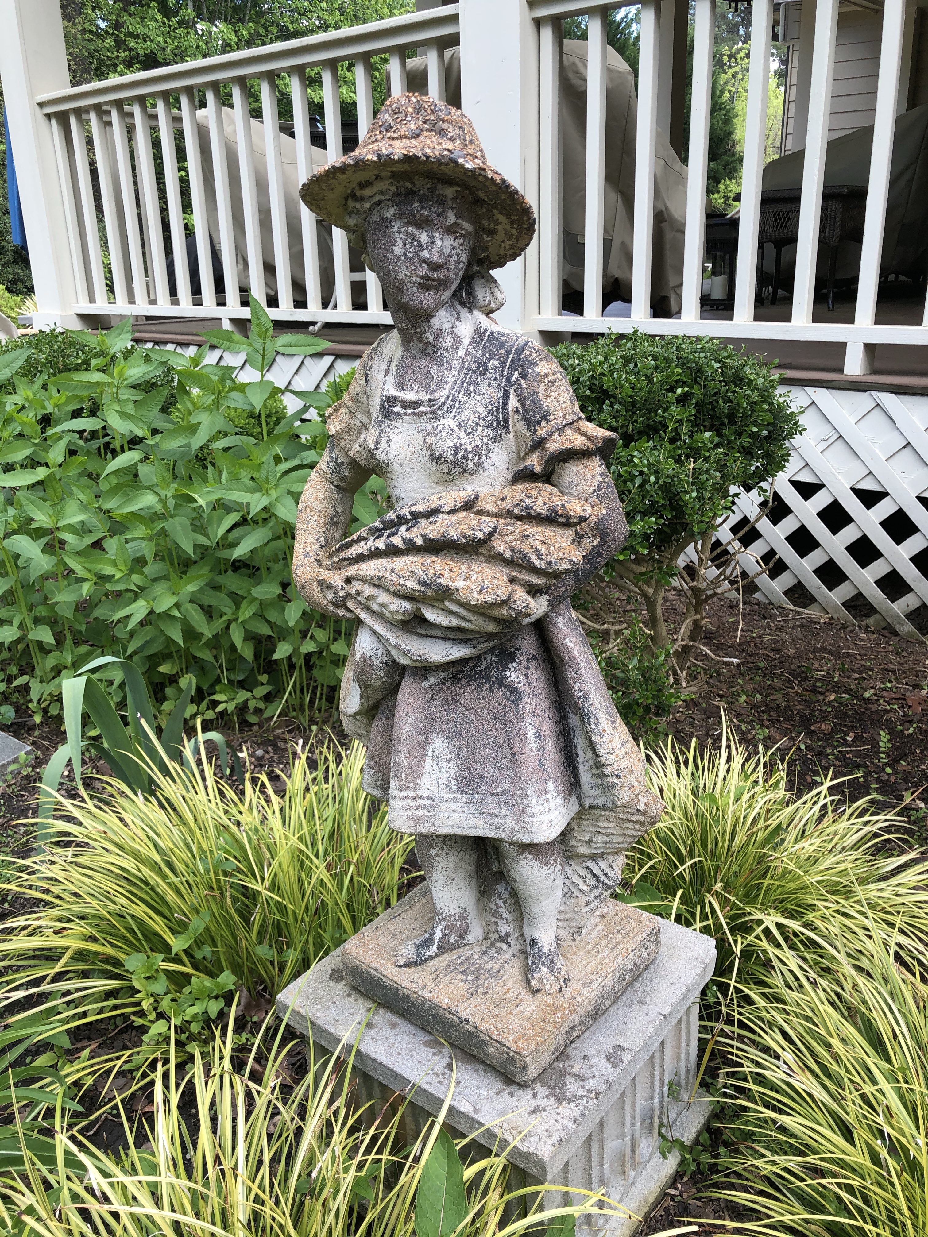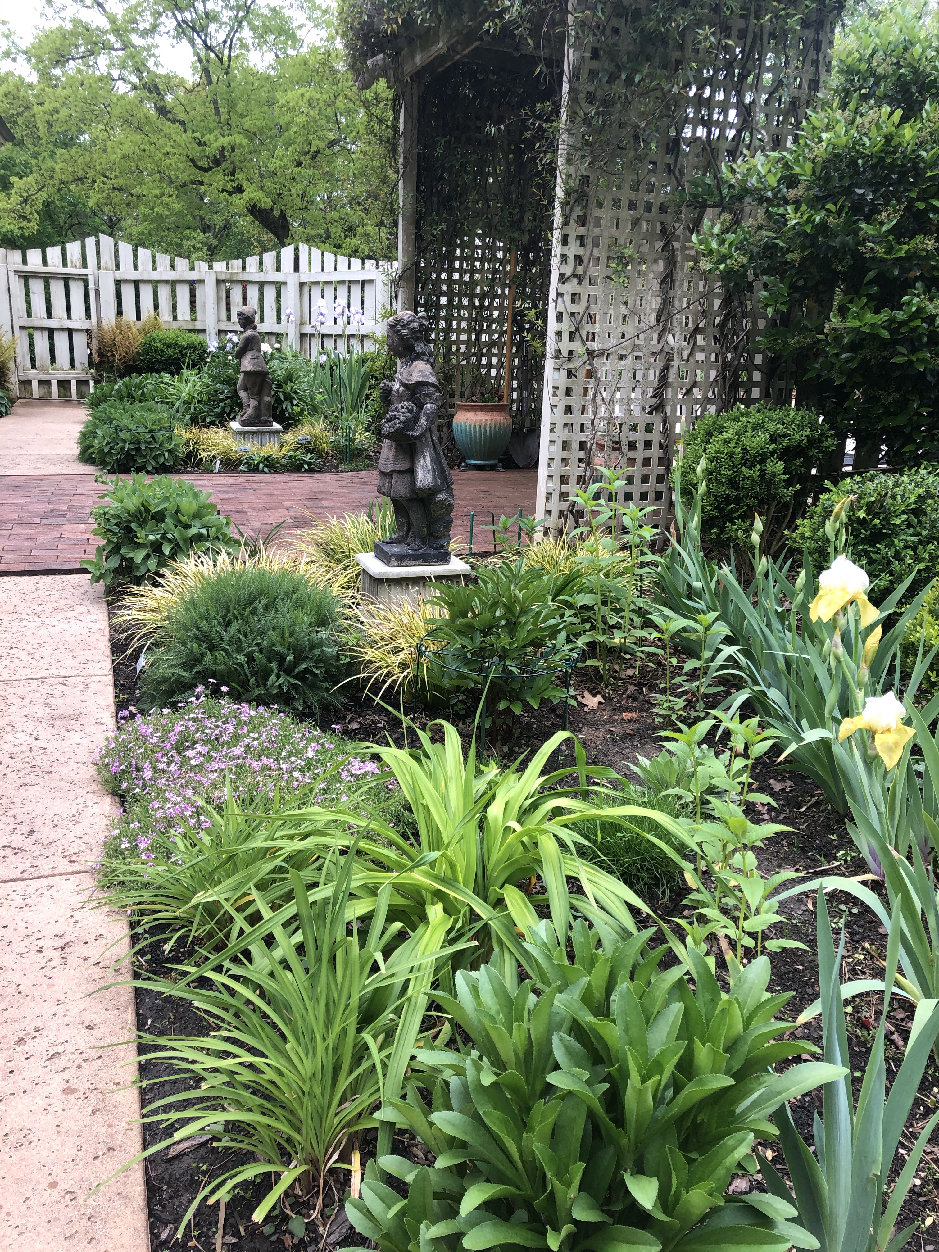 We made it into a themed garden divided into quadrants and enclosed by a scalloped wood fence. There are two gates, one of which is double and covered by an arbor. Walkways cross a large brick paved center path that divides the space into four planting beds. Each quadrant contains a statue on a pedestal that depicts the seasons of the year. Two of the statues came from Frank and Louise Liddell’s cabin at Lake Lanier. How the set was completed is a story for another blog entry.