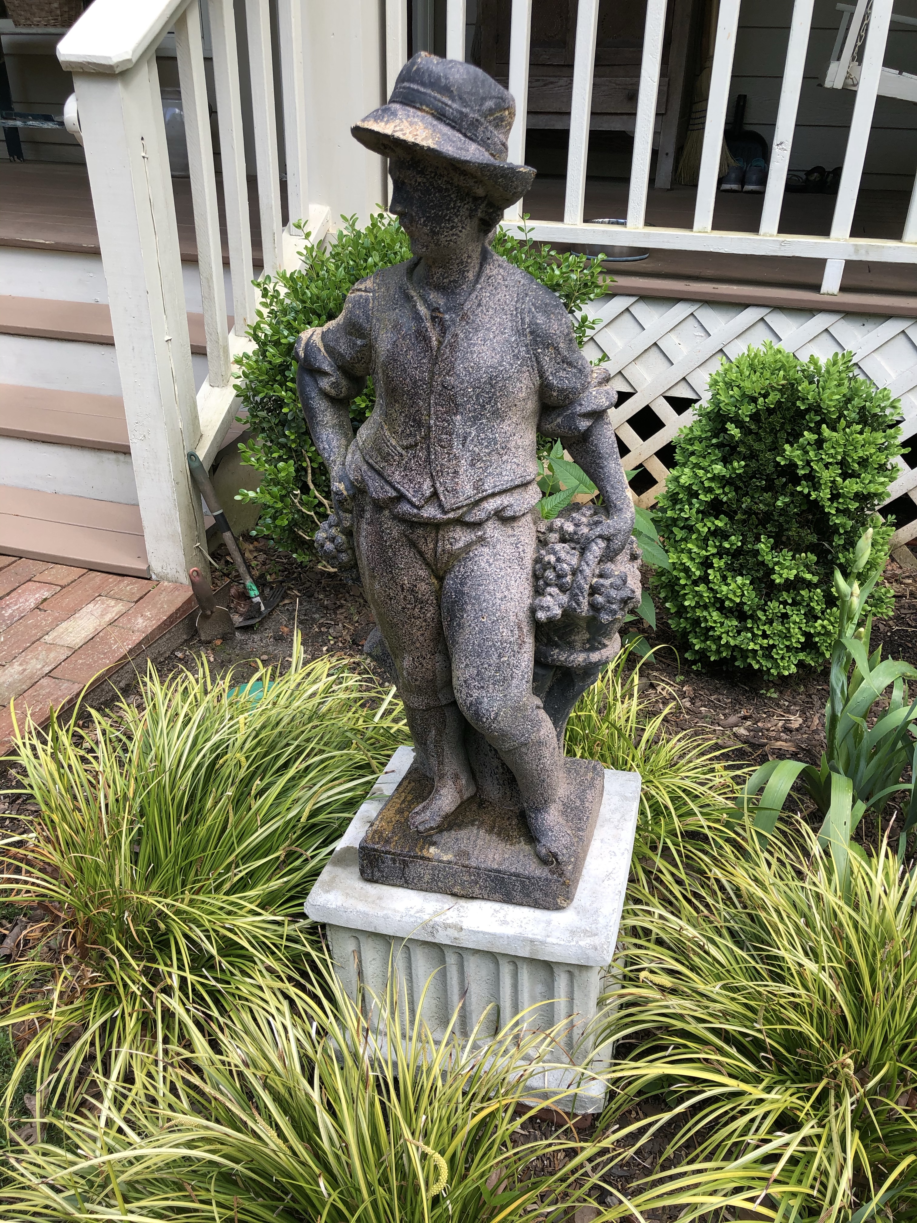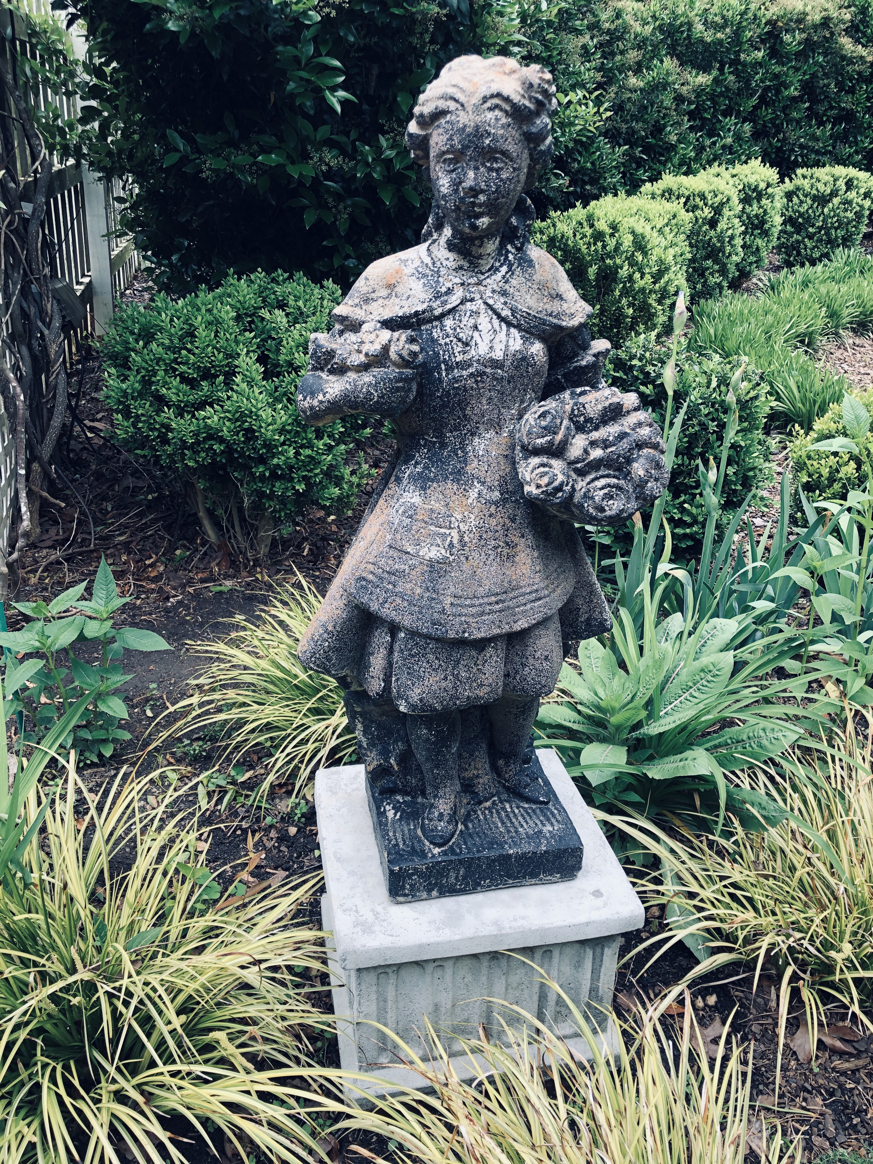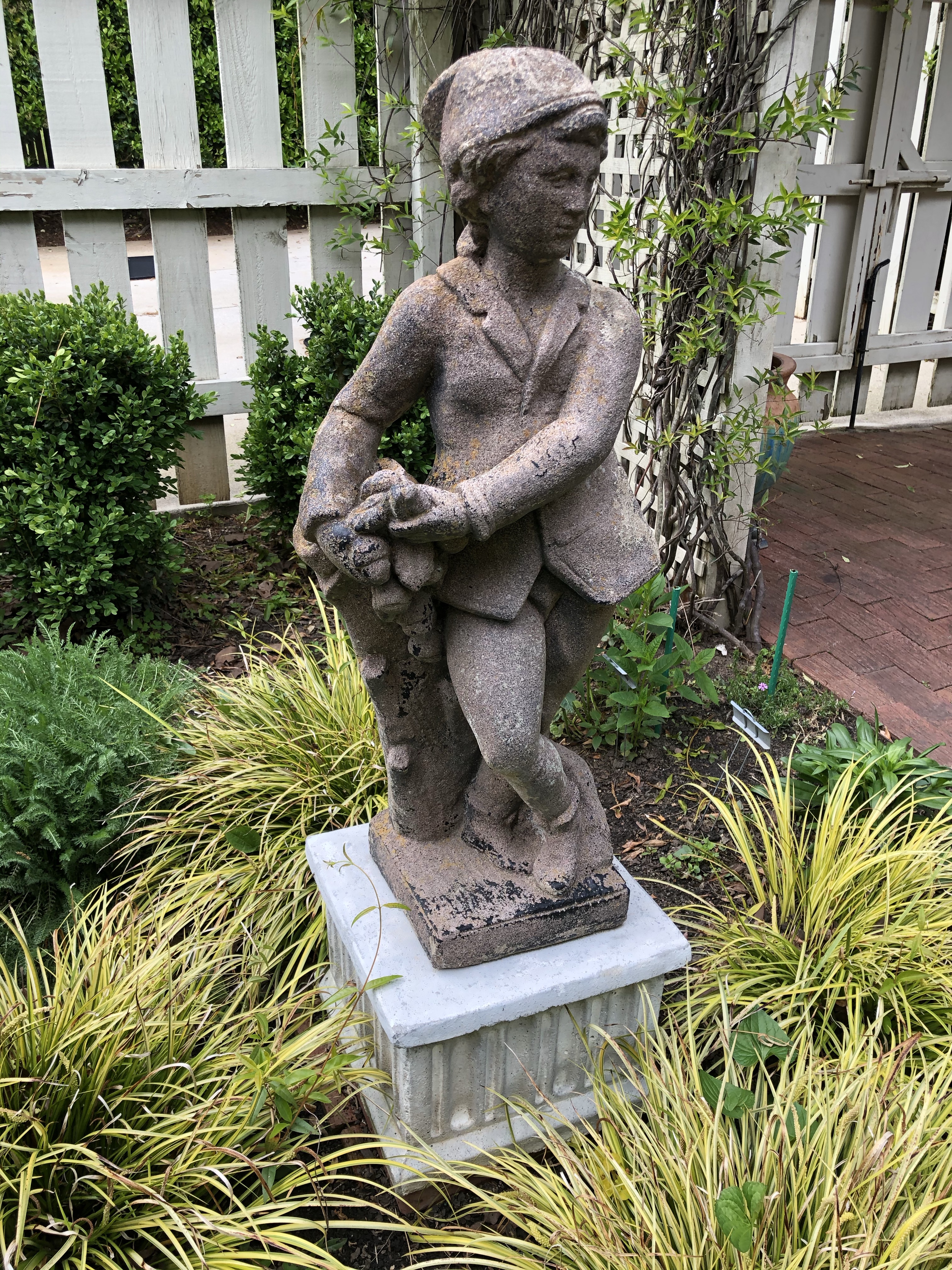 We made it into a themed garden divided into quadrants and enclosed by a scalloped wood fence. There are two gates, one of which is double and covered by an arbor. Walkways cross a large brick paved center path that divides the space into four planting beds. Each quadrant contains a statue on a pedestal that depicts the seasons of the year. Two of the statues came from Frank and Louise Liddell’s cabin at Lake Lanier. How the set was completed is a story for another blog entry.