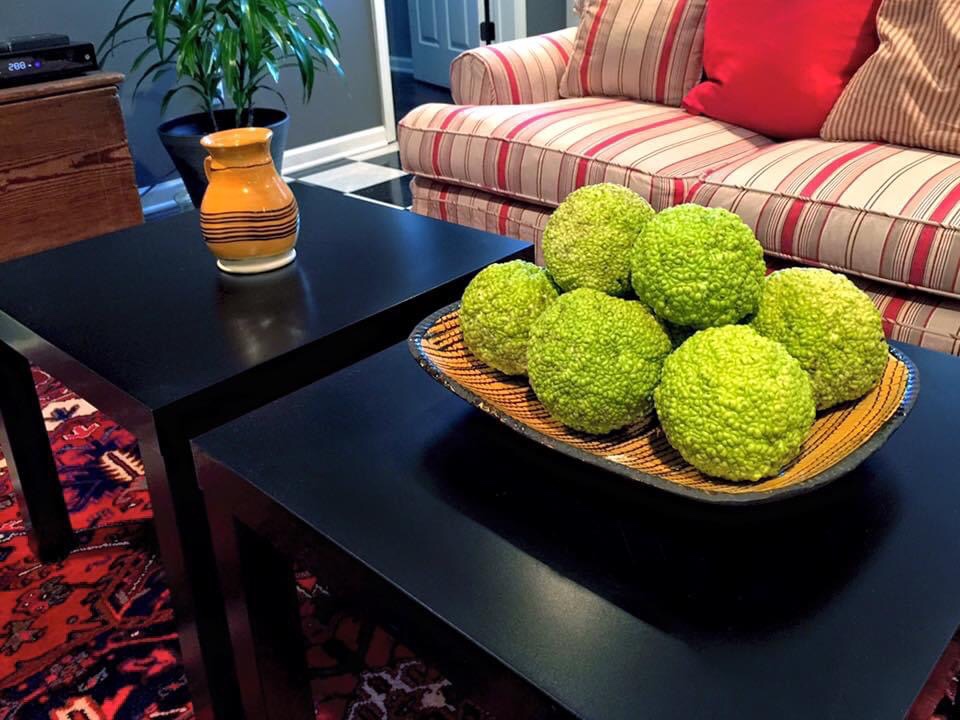 Will Green gathered these Osage Oranges which are also called hedge apples. He displayed them in his living area in our terrace level.